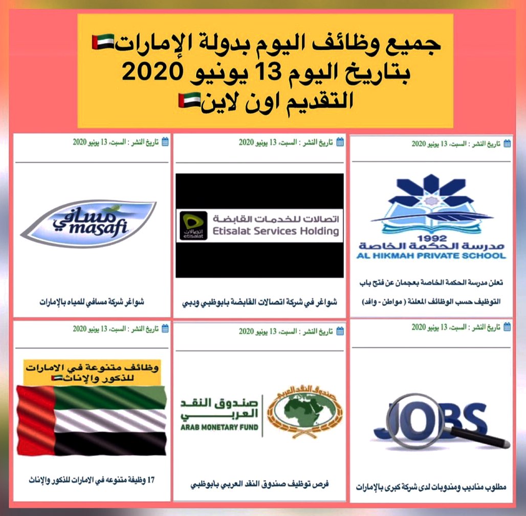 جميع وظائف اليوم بدولة الإمارات بتاريخ 13 يونيو 2020 التقديم اون لاين